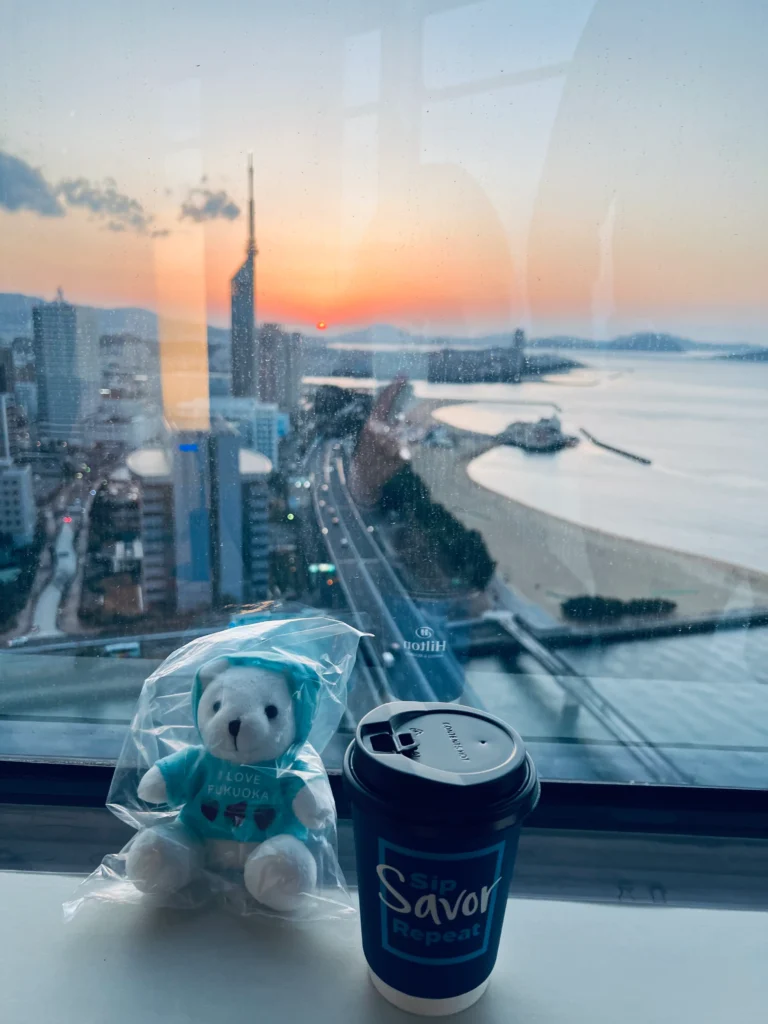 この日は天気が良く、15時ごろは海と空の青さを楽しんで、夕暮れには空がオレンジから紫に変わるグラデーションに染まっていく景色を、ソファに座って眺める時間はとても贅沢な過ごし方でした。コーヒーはラウンジで持ち帰れます。