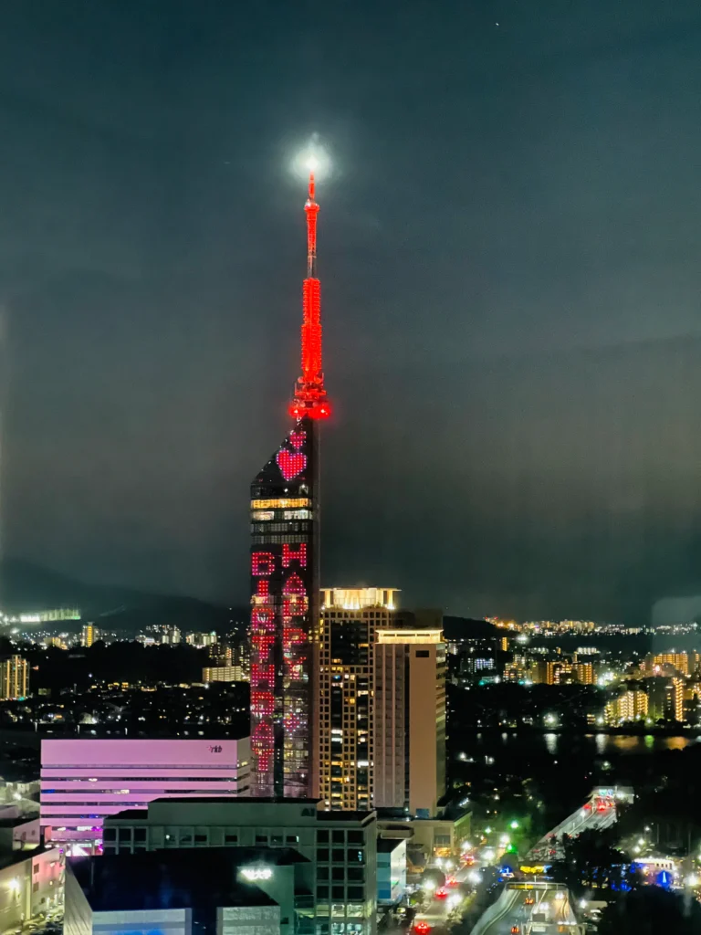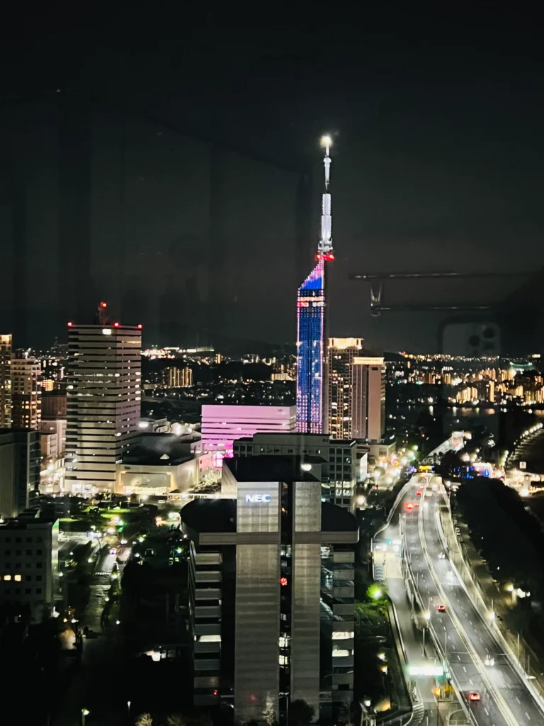 福岡タワーのイルミネーションが急に動き出してこんな可愛い仕様に!ヒルトンに泊まっている人たちが見えるように「HAPPY BIRTHDAY」の文字が!!こんな素敵な演出あるんですね(*´﹀`*) 文字が動いたり、ハートが飛んだりと1分近くイルミネーションが動いており感動しました。