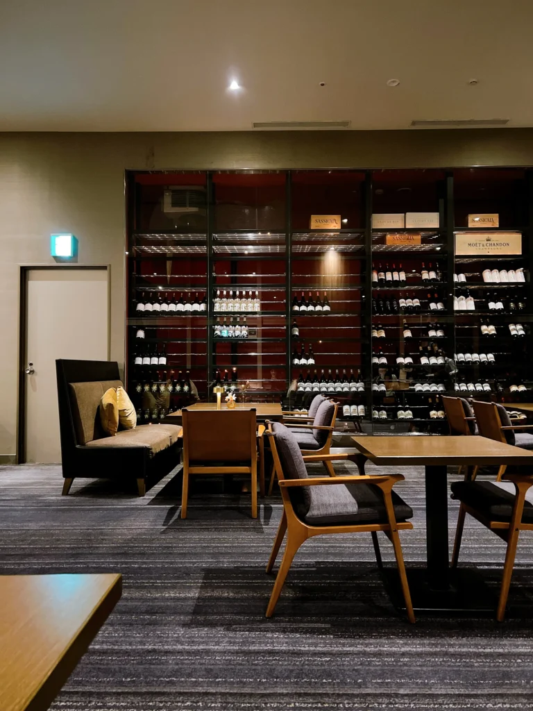 店内は広くソファ席が多いため、4人で来てもゆったりと過ごせそうです。夜景が見える窓の対面に、ワインが壁一面にずらりと保管されていました。