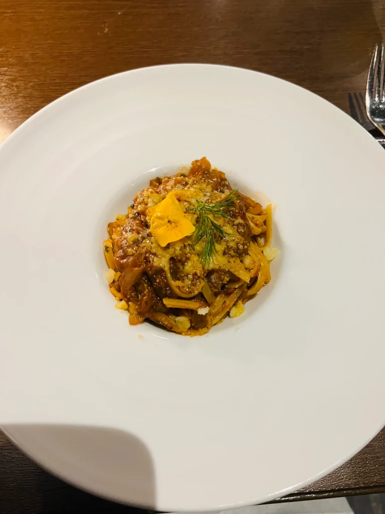 食事はニューヨークステーキ フライドポテト添えリングイーネ アマトリチャーナを頂きました♡写真はリングイーネです。お肉は焼き加減が絶妙で柔くジューシーでした。パスタは一人前に取り分けてもらいました。ミートソースとチーズがパスタに絡まって、あまりの美味しさに夫と顔を見合わせるほど!!締めの食事にぴったりでした。