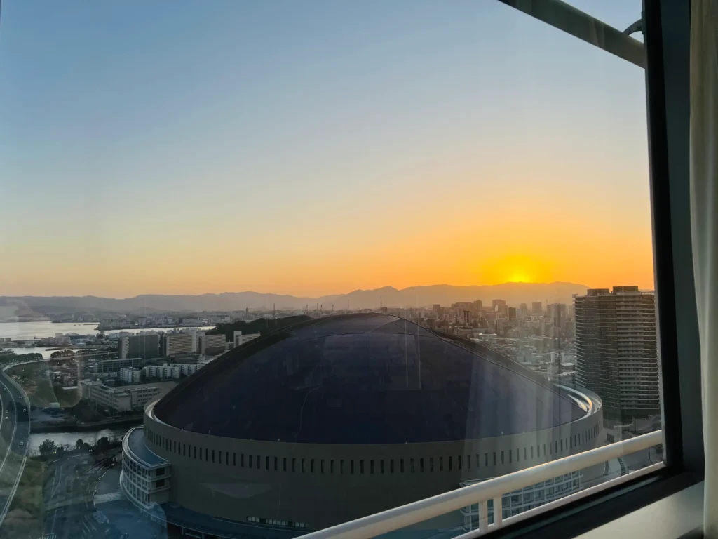 また、東側にはキングサイズのベッドルームがあり、寝ながらみずほPayPayドームの巨大な銀色の屋根が広がり、そのスケール感に圧倒されます。朝はこちら側から朝日が望めて、気持ちのいい目覚めになりました!